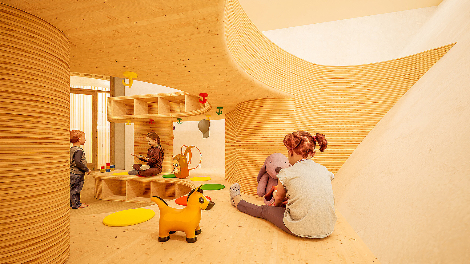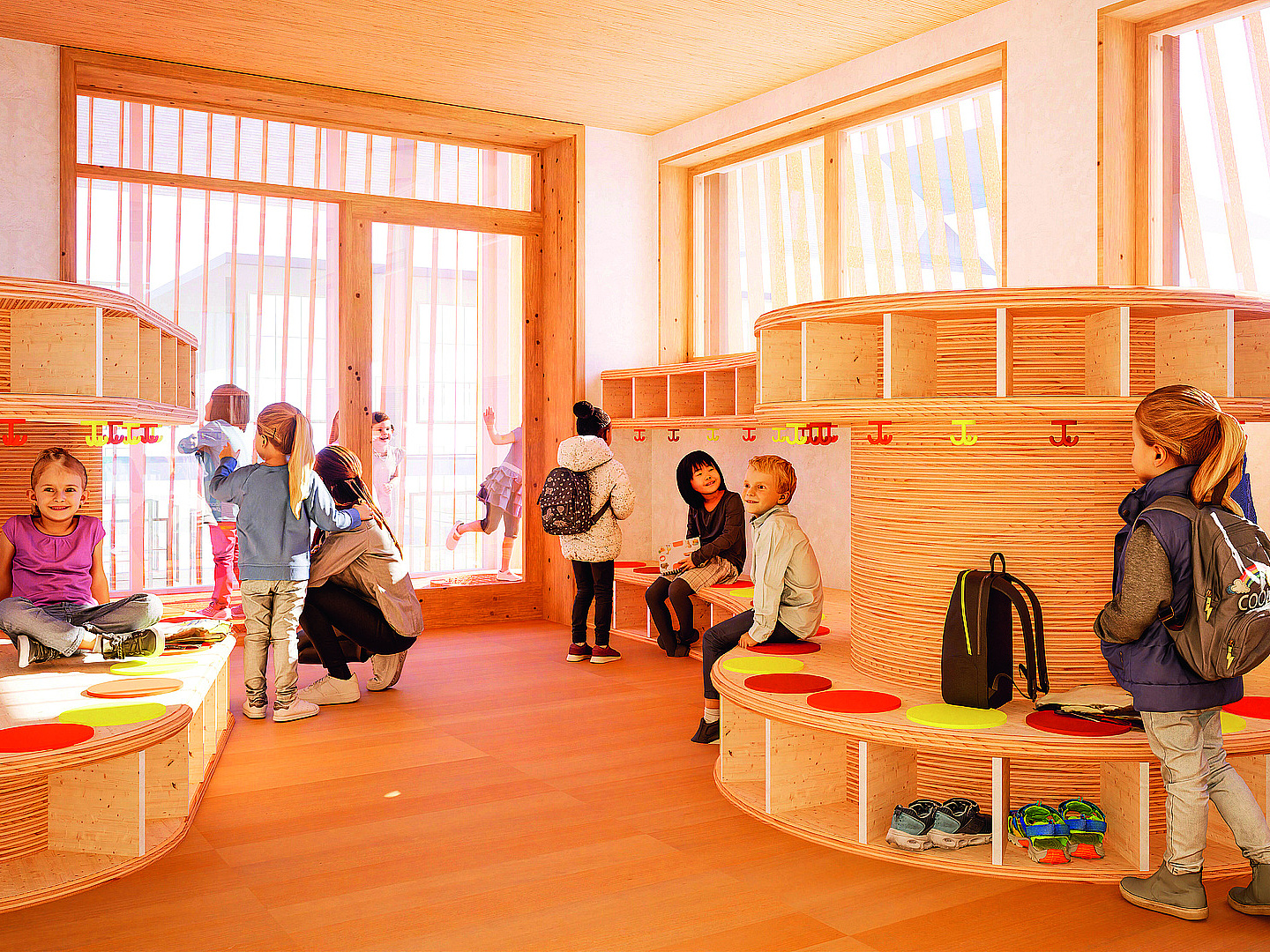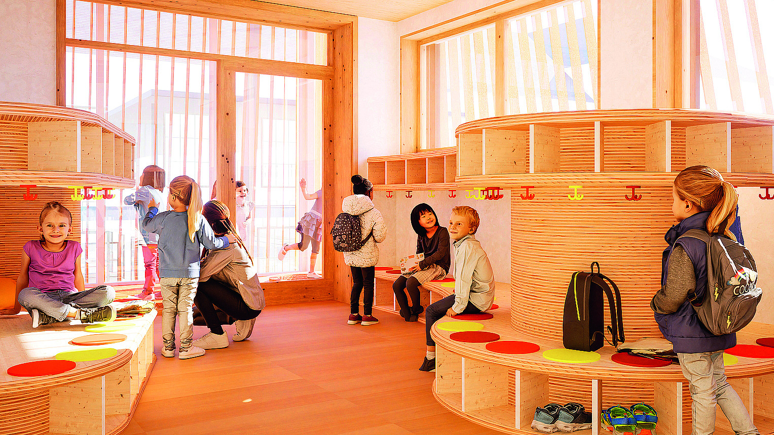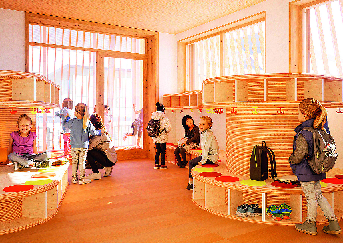 The building's "rucksack" contains a slide, which provides the children a further opportunity of fun and exercising in the building.