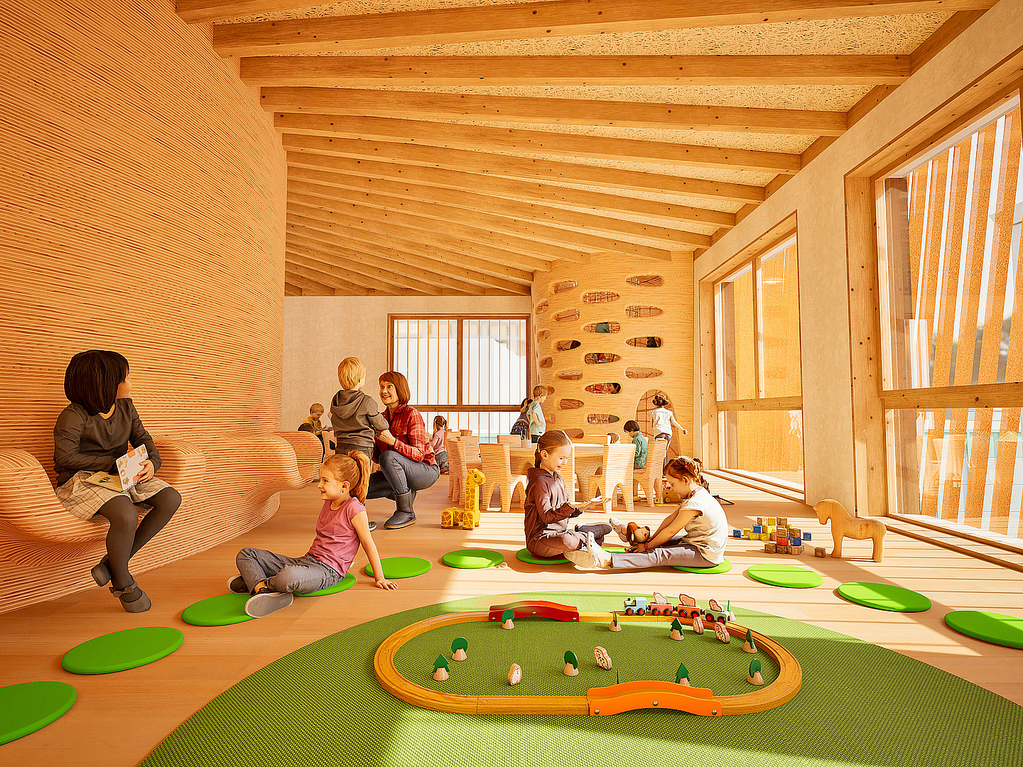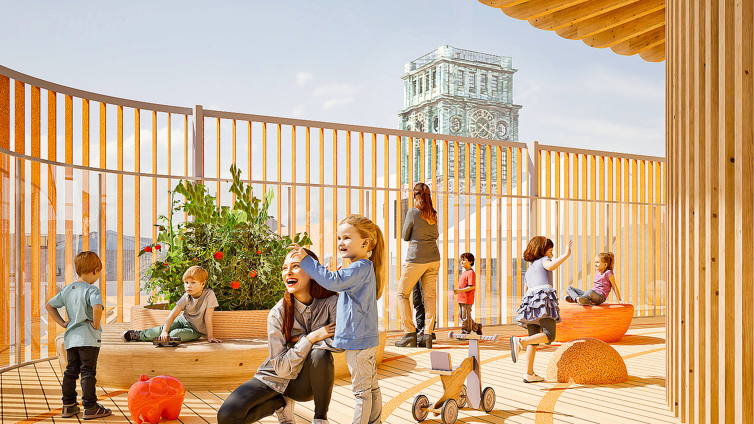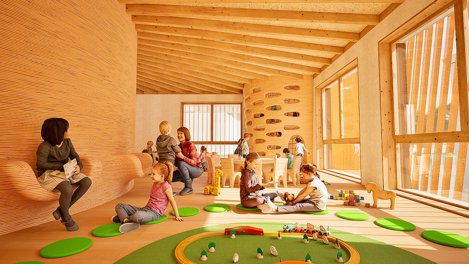 Both the roof terrace as well as the childcare centre's own playground next to it serve as outdoor play areas. Here the children can discover nature, play in the sandpit or climb the small tree house and discover their personal retreat.