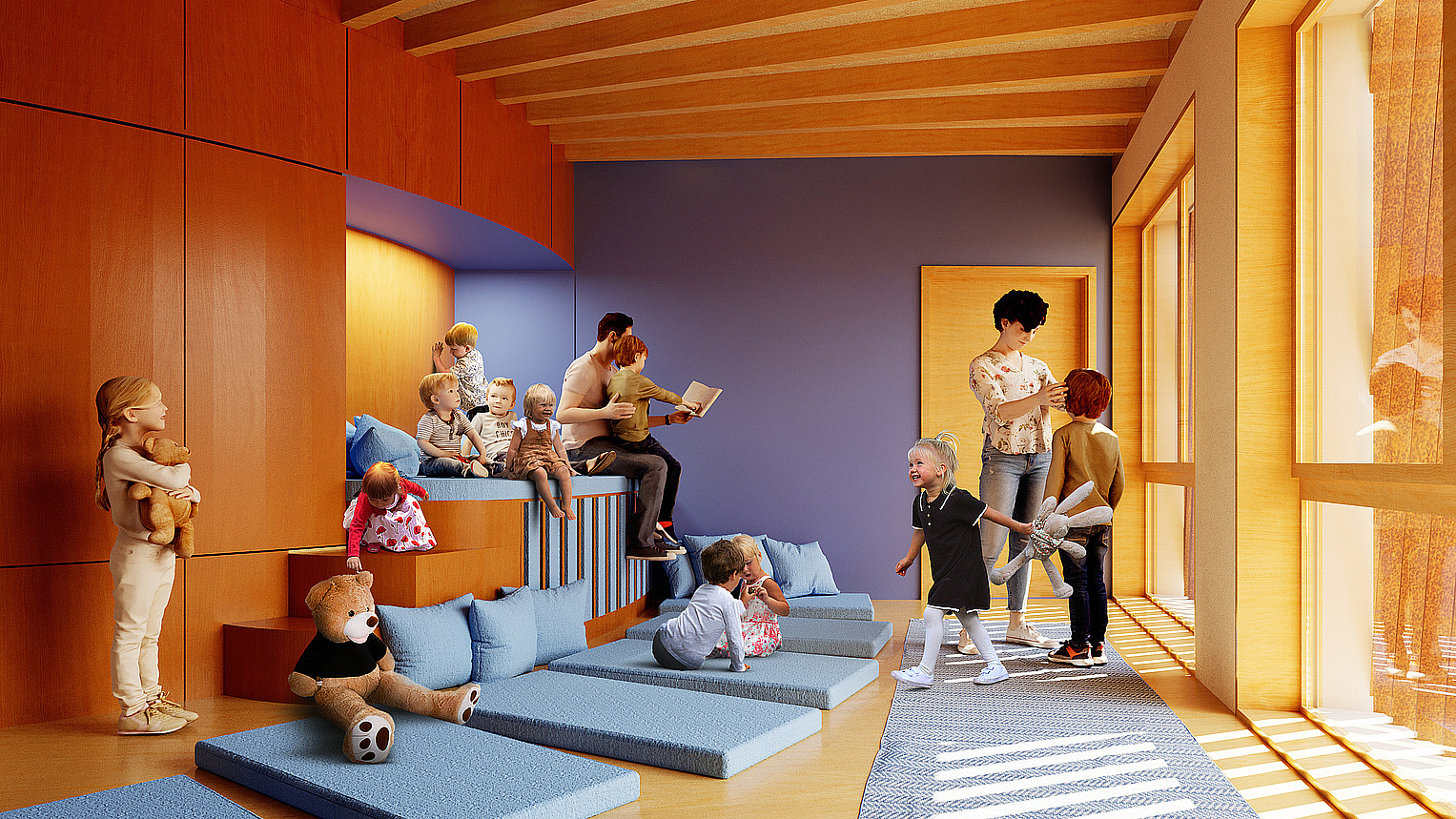 On the fifth floor, next to the roof terrace, an additional room has been created, intended for instance for quiet games, as well as an area for parents, where one can meet, for parent cafés or for working in peace during the first separations while your child is settling in.