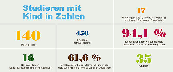 Der Bereich "Studieren mit Kind" des Studierendenwerks München Oberbayern setzt sich gezielt für die Belange studierender Eltern ein und bietet ihnen umfassende Unterstützung. Eine zentrale Aufgabe besteht in der fachlichen und organisatorischen Begleitung der 17 Betreuungseinrichtung des Trägervereins Studentische Eltern-Kind-Initiativen e.V. in München, Garching, Martinsried, Freising und Rosenheim. Auch im Jahr 2024 profitieren Kinder von Studierenden und Hochschulangehörigen dort von einer qualifizierten pädagogischen Betreuung.