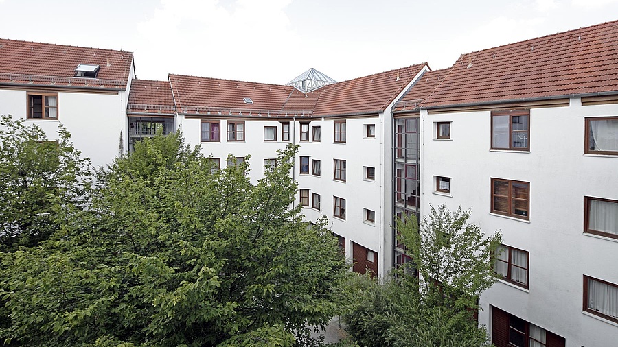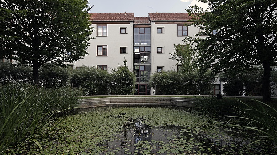 Dass beinahe 400 Studierende in der Wohnanlage leben sieht man, wenn überhaupt erst auf den zweiten Blick. Erbaut im Stil der 80er Jahre wirken die Gebäude wie eine "ganz normale" Familiensiedlung. Der Innenhof eignet sich gerade im Sommer zum gemeinsamen Beisamensitzen rund um den hauseigenen Gartenteich der die Anlage wie einen kleinen Park aussehen lässt. Ein Gefühl von Ruhe und Entspannung lassen hier nicht lange auf sich warten.